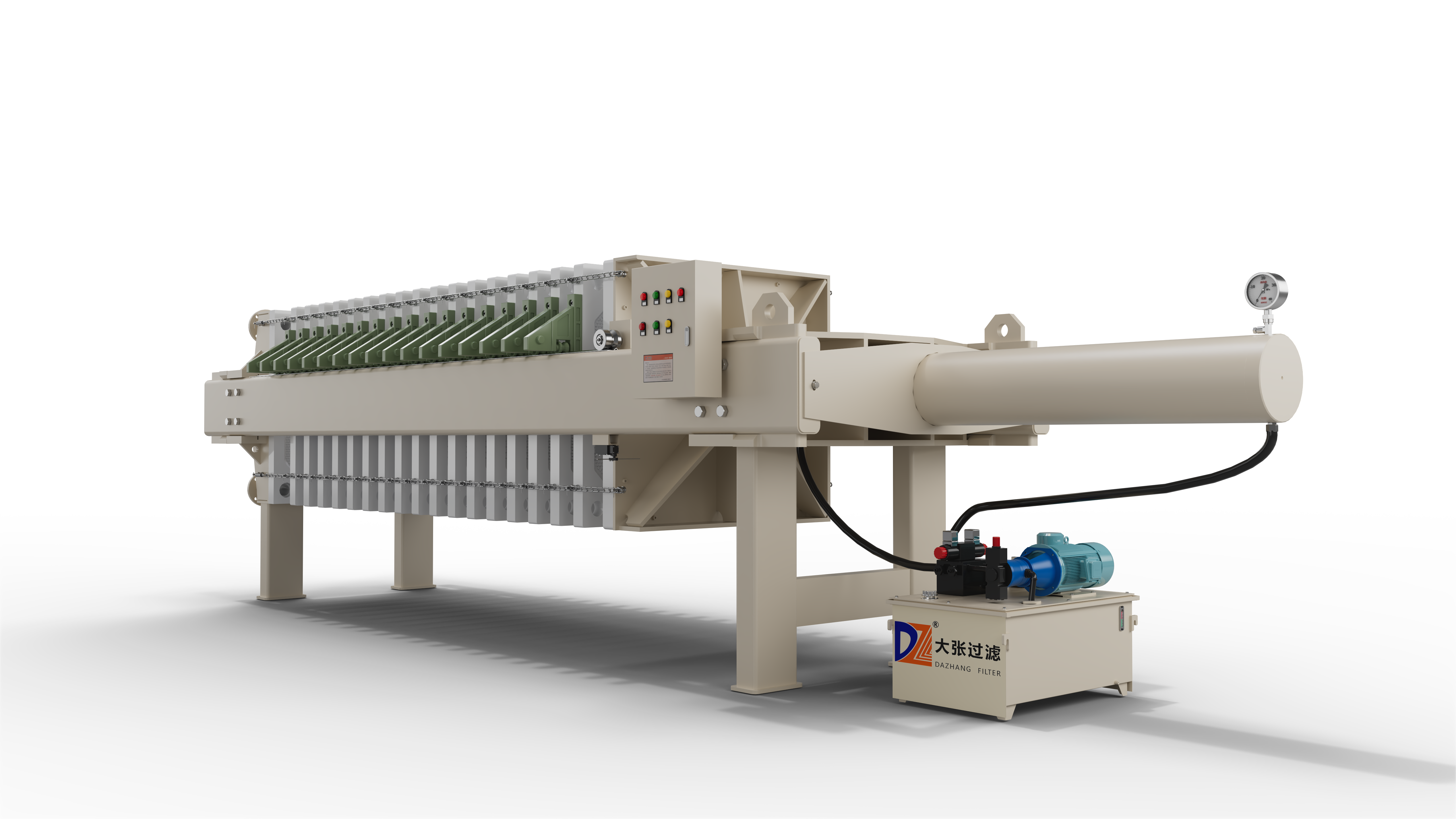 一次快速拉開壓濾機,采用加長型的油缸驅動,配合加長機架,通過不銹鋼鏈條(或滑片)帶動連接每一塊濾板,在壓緊板的帶動下實現濾板的一次性全部打開。配合自動振打裝置,對等距離拉開的濾板實現震動輔助卸料功能,可實現全自動卸料。